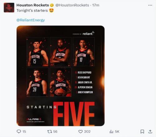 杜兰特迎来火箭首秀进入先发阵容,谢泼德依旧是先发一号位。