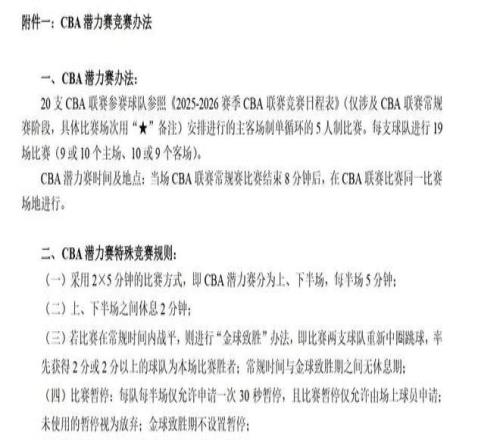 CBA新赛季的重大改革可谓双管齐下,首先,比赛单节时间从12分钟调整为10分钟,使比赛总时长从48分钟压缩至40分钟,这与国际篮联标准保持一致,缩短比赛时长的讨论自2023年中国男篮兵败世界杯后便一直存在,前中国男篮主帅乔尔杰维奇曾指出,CBA比赛时间长但强度低,导致球员在国际赛场难以适应节奏,更引人注目的是“CBA潜力赛”的推出,据多家媒体报道,这所谓的“第五节”将安排在常规比赛结束8分钟后进行,采用2×5分钟的比赛方式,上下半场之间休息2分钟,若比赛在常规时间内战平,则采用“金球致胜”机制,双方重新中圈跳球,率先获得2分或2分以上的球队获胜