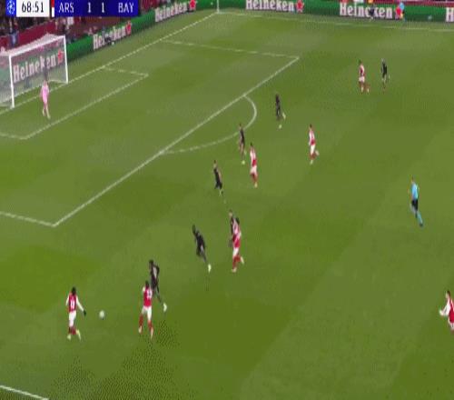 下半场比赛开打之后,阿森纳连续利用定位球的机会,制造出了有威胁的进攻,让拜仁的门前风声鹤唳,第62分钟赖斯左路杀入拜仁禁区,调整一步后抽射远角,被诺伊尔伸腿挡出,错失再次领先的绝佳机会。
