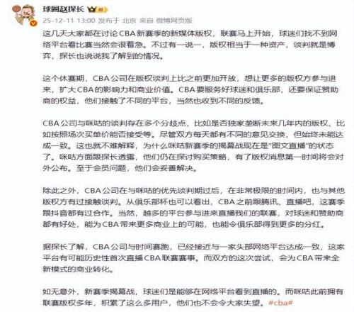 可惜,CBA公司不认可,觉得这个价格低了,人家还想要更高的价格。于是,双方谈不妥,就出现了现在的局面,明天联赛就要开始了,网络直播还没搞定平台。