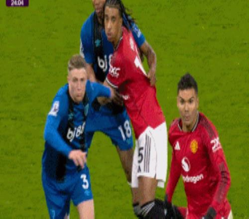 上半场补时,曼联任意球机会,伯恩茅斯球员有明显的手球,裁判却再次没有表示,只是判罚了角球。