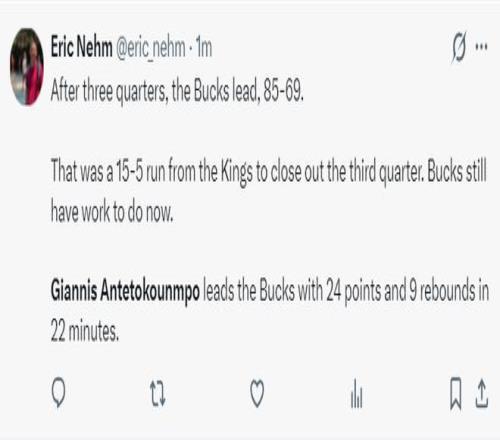 上半场打完雄鹿已经领先国王18分,第三节两队就是对攻了,扬尼斯单节7分钟5中3拿到9分3篮板1助攻,三节扬尼斯仅出战22分钟不到。