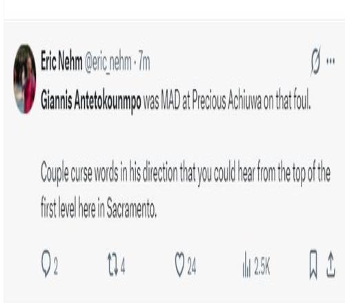 国王现场记者写道:扬尼斯对阿丘瓦那个动作非常不满,他很大声的骂了脏话,我在看台的第一层都能听见。