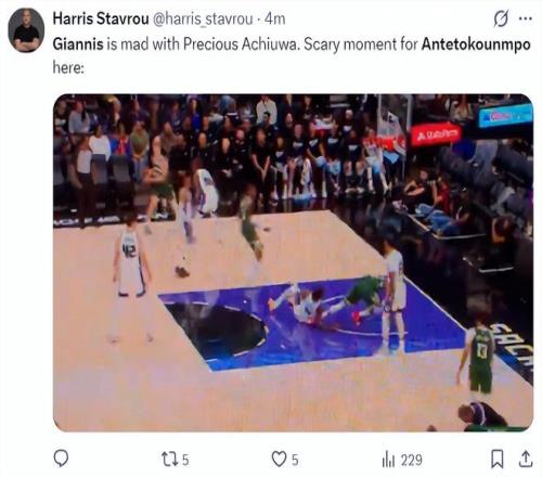 这场比赛对于雄鹿球迷来说出现了惊魂一幕,阿丘瓦与扬尼斯卡位,阿丘瓦倒地了随后阿丘瓦直接拉着扬尼斯的小腿将扬尼斯撂倒,这个动作非常的危险,字母哥随即大骂阿丘瓦。
