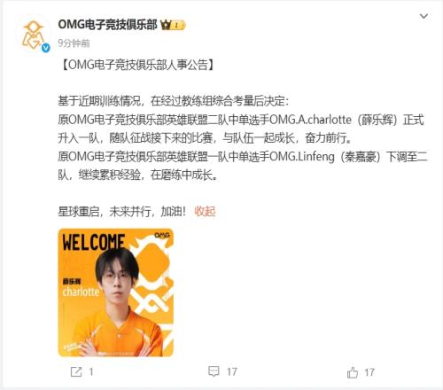 OMG俱乐部官方:中单Linfeng下调二队,二队中单升入一队首发!